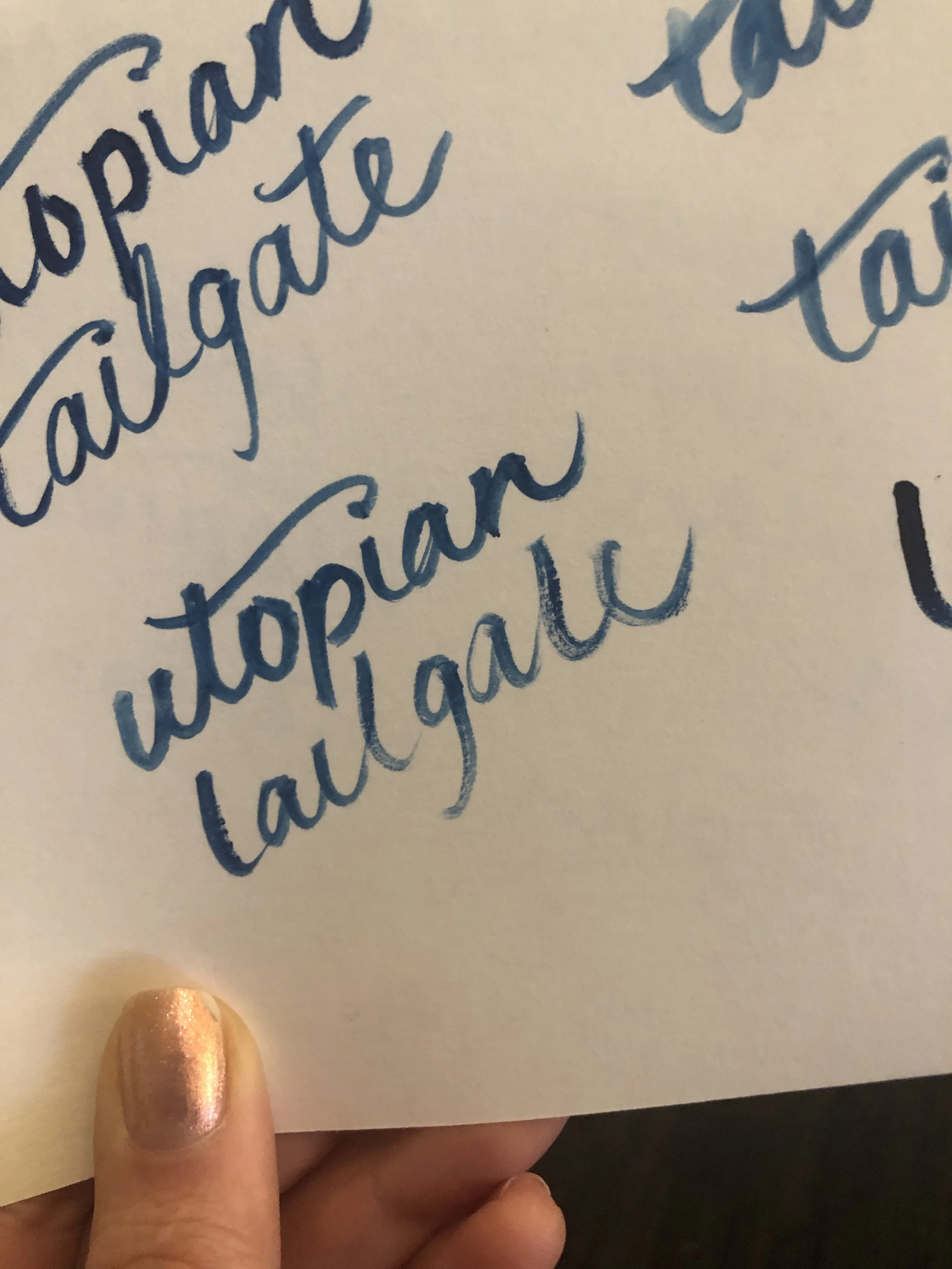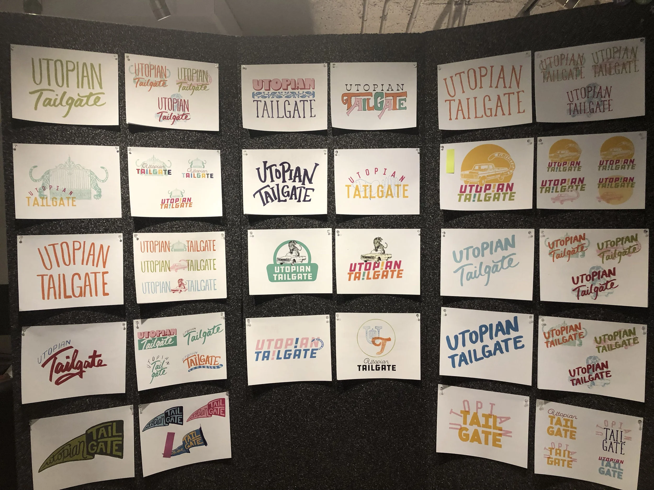 At every point of seeing this process through, Sara and I looked to the tenants of "Yes, And" to guide us. We started with word association to craft the story of each of the concepts and the folks that would visit, eventually landing us on the phrase "Utopian Tailgate," the final concept and the name of the bar. The next step involved rigorous research to determine what exactly a Utopian Tailgate looked like. We started big, working down from four 40"x17" mood boards to three 8.5"x11" pages. From there, we created countless logo drafts, accepting each idea as a gift to inspire us to the next level. This continued as we received initial concepts from interior designers and architects. As new collaborators hopped on board, we worked in-the-moment as brand experts and creative consultants; directing the vision and heightening the concept to what it is today.